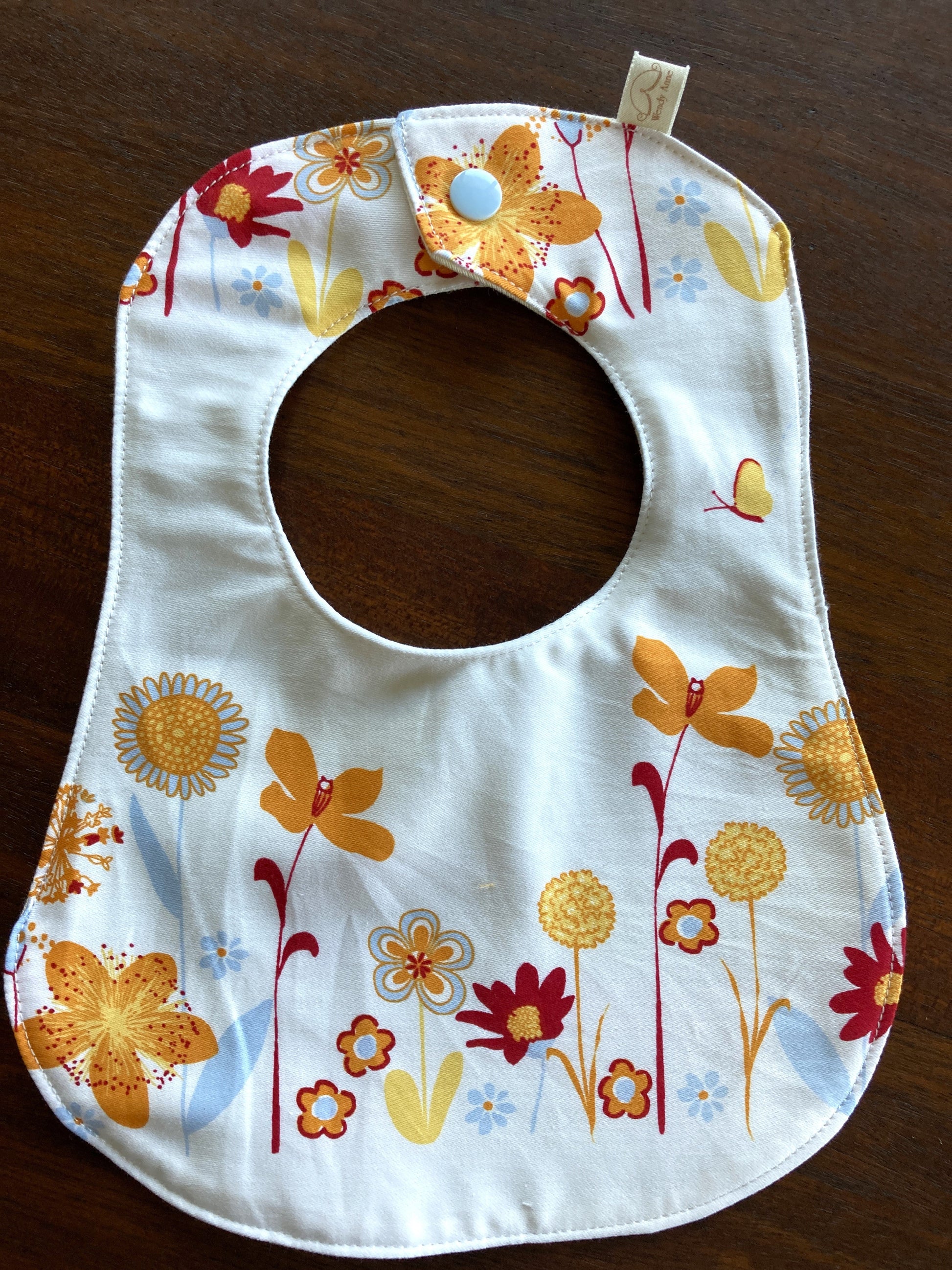 Thoughtful baby gift set with 10 different flowers on front, including daisies, butterflies and dahlias. Matched with mango orange organic cotton double gauze on backing.
