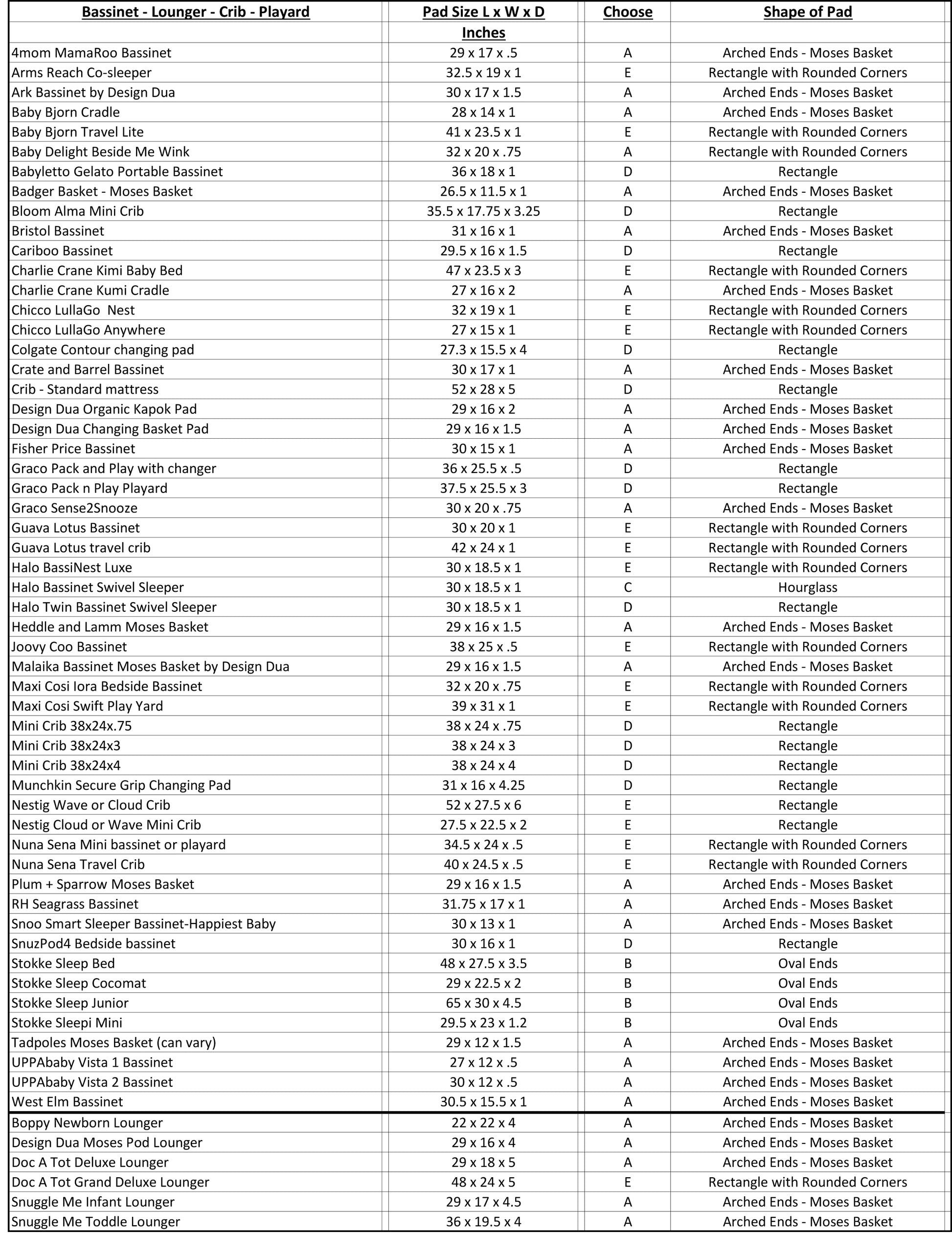 Examples: Moses basket or changing basket pad, bassinet, cradle, crib, mini crib, pack n play, playard and Stokke mattress pads, just to name a few.