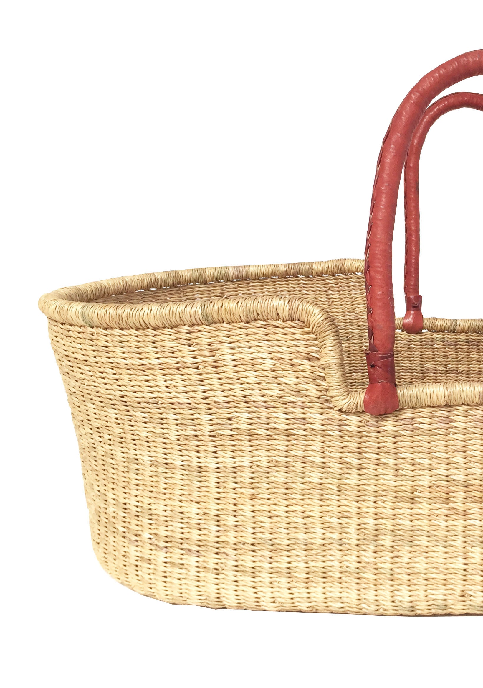 African Styled Moses Basket Hand Woven in Ghana - Reddish Brown Leather Handle